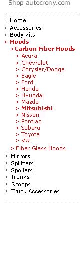 Chevrolet Carbon Fiber Hoods Chrysler-Dodge Carbon Fiber Hoods Mazda Carbon Fiber Hoods Mitsubishi Carbon Fiber Hoods Honda Carbon Fiber Hoods Eagle Carbon Fiber Hoods Ford Carbon Fiber Hoods Hyundai Carbon Fiber Hoods Pontiac Carbon Fiber Hoods Toyota  Carbon Fiber Hoods Subaru Carbon Fiber Hoods Hoods Fiber Glass Hoods Nissan Carbon Fiber Hoods VW Carbon Fiber Hoods Body Kits Accesories Home Carbon Fibr Hoods Truck Accesories Acura Carbon Fiber Hoods Spoilers Scoops Trunks Mirrors Splitters