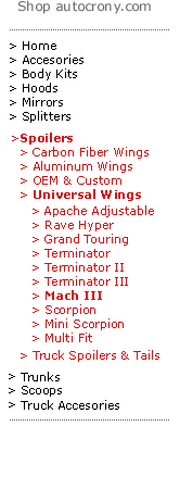 MirrorsHoodsSplittersTruck AccesoriesScoopsTrunks Home Accesories Body Kits Carbon Fiber Wings, Spoilers Aluminum Wings, Spoilers OEM and Custom Spoilers Universal  Wings, Spoilers Truck Spoilers and Tails Spoilers Apache Adjustable Wing Rave Hyper Wing Grand Touring Spoilers Terminator Terminator II Terminator III Mach III Spoilers Scorpion Spoiler Mini Scorpion Spoiler Multi Fit Spoilers